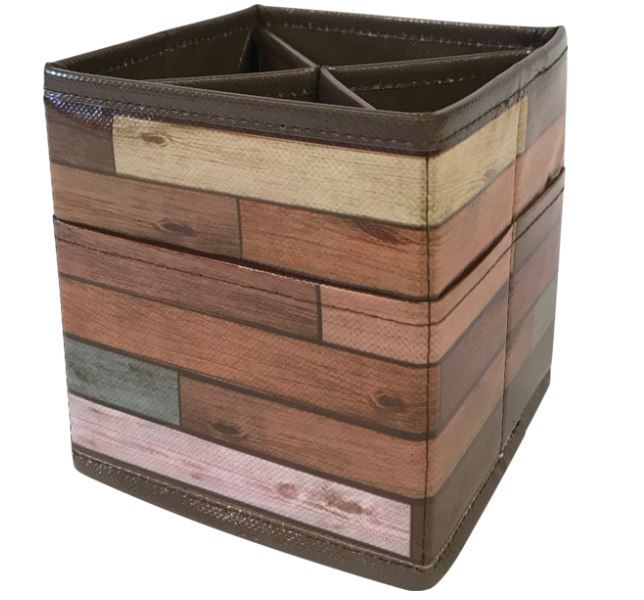 Keep your supplies neat and within reach with this rustic designer desktop organizer. It features a write-on/wipe-off surface for convenient labeling and easy cleaning. A removable separator allows you to create up to four sections, and the small front pocket is great for keeping slips of paper handy. You can also remove the inner base to fold for easy storage. 5¼" L x 5¼" W x 5½"H.